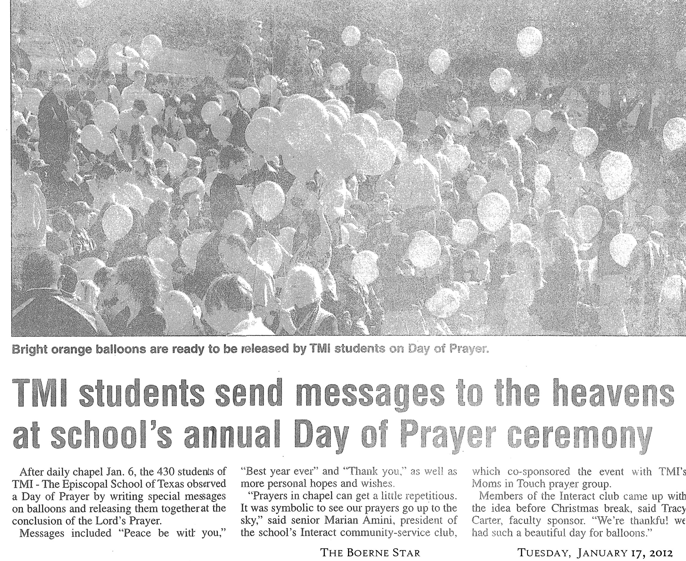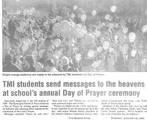 News Clippings TMI students send messages to the heavens The Boerne Star January 17, 2012 Share this: Share on X (Opens in new window) X Share on Facebook (Opens in new window) Facebook Like this:Like Loading...