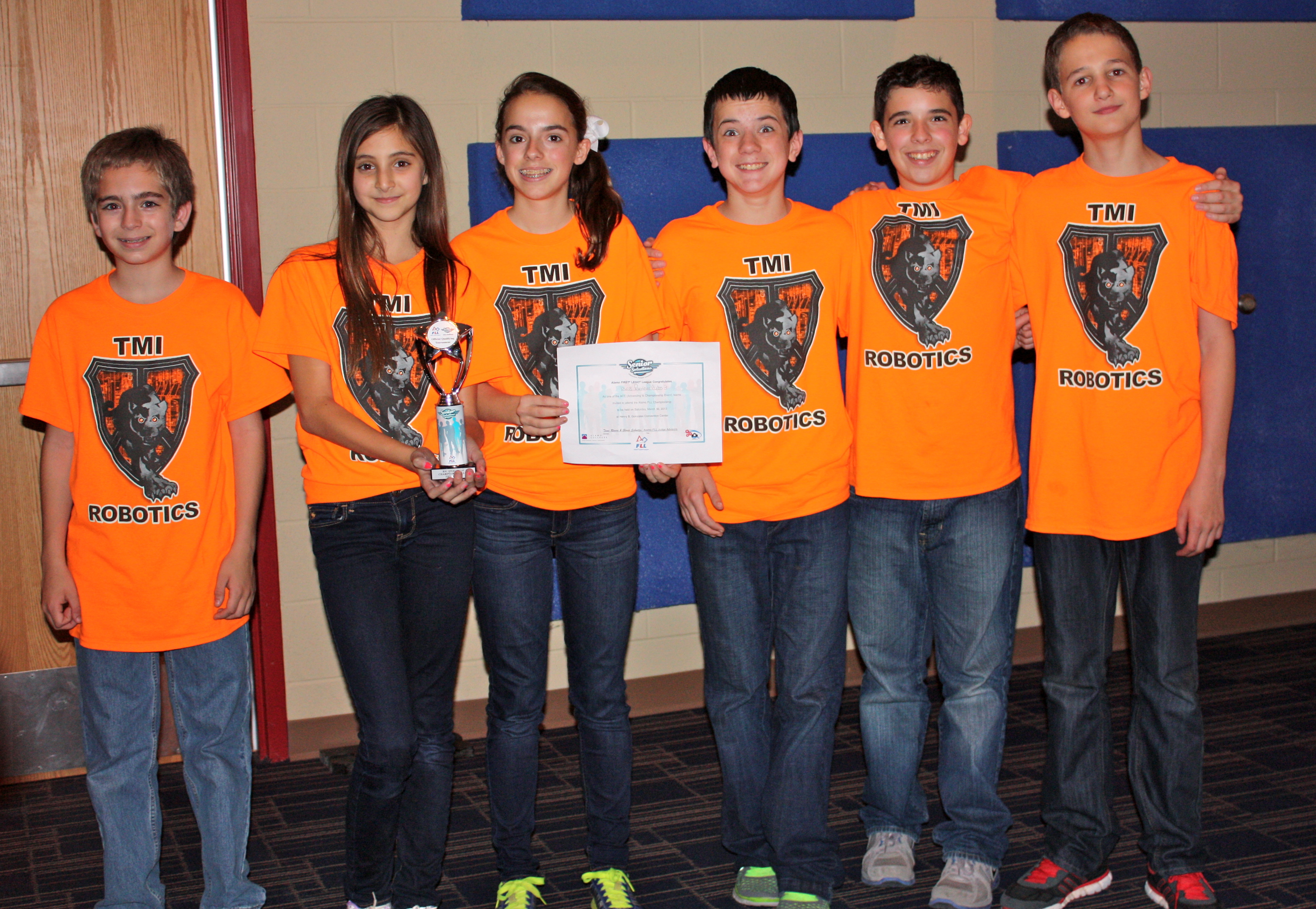 TMI First Lego League (FLL) Team 12608- Don’t Try This at Home (above) competed this weekend at the FIRST Alamo Regional FLL Qualifier at Roosevelt HS against 24 other FLL teams. The team presented their Project Presentation of the Handy Hand, an electronic extending grabber to help seniors with trouble reaching down and up due to arthritis in their back, participated in a Robot Design interview and a Core Values interview. Then each of the team members, in pairs, took turns at driving the robot on the playing field. At the end of the day, the team won 2nd place over all and got an invitation to the FIRST Alamo Regional Championship on March 30th. Congratulations to all members of the 7th grade rookie FLL team – Thomas Anderson, Ethan Arellano, Brooke Kotopoulos, Annie Domit-Suarez, and Matt Bowler!