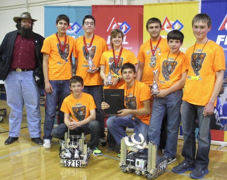 TMI’s freshman, Team 6219 received the Think Award: This judged award is given to the team that best reflects the “journey” the team took as they experienced the engineering design process during the build season. The Engineering Notebook is the key reference for judges to help identify the most deserving team. The team’s Engineering Notebook should focus on the design and build stage of the team’s robot. Journal entries of interest to judges for this award will include those describing the steps, brainstorms, designs, re‐designs, successes, and those ‘interesting moments’ when things weren’t going as planned. A team will not be a candidate for this award if they have not completed the section of the Engineering Notebook describing the team’s experience.