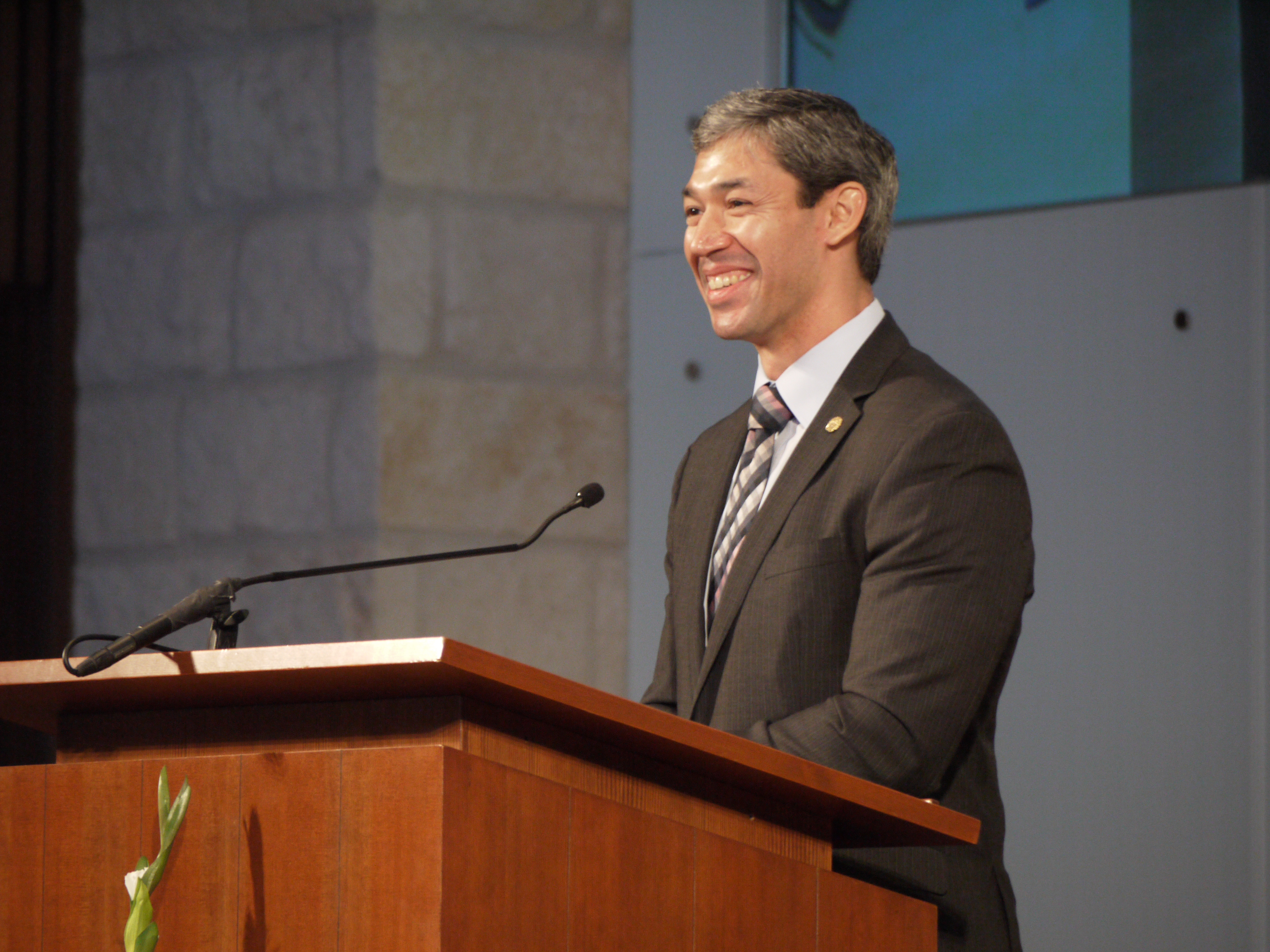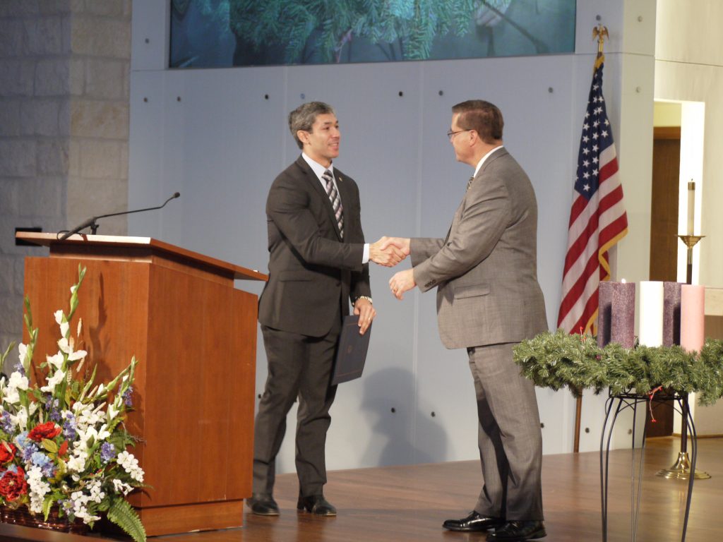 City Councilman Ron Nirenberg presented a proclamation recognizing the 120th anniversary of the founding of TMI – The Episcopal School of Texas on Dec. 3 during a daily chapel service in the school’s All Saints Chapel. Headmaster John W. Cooper, Ph.D. welcomed the councilman, whose District 8 includes TMI, and received the proclamation from him.