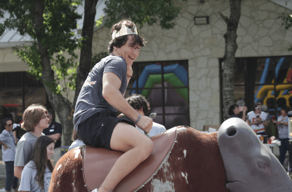 The homecoming carnival featured creative activities from the Upper and Middle School Student Council, Spanish Club, Girl’s Lacrosse Club, Art Club, Gaming Club, Latin Club, and more! Featured attractions included the dunk tank, bounce obstacle courses, a rock wall, and even a mechanical bull. Treats provided by the various clubs included snow cones, popcorn, cotton candy, tacos, and donuts from the Journalism Club! Students spent the afternoon competing against each other in the bounce-house obstacles, video games, rock wall, and donut-eating contest. What fun activities will we see in next year’s Homecoming carnival?